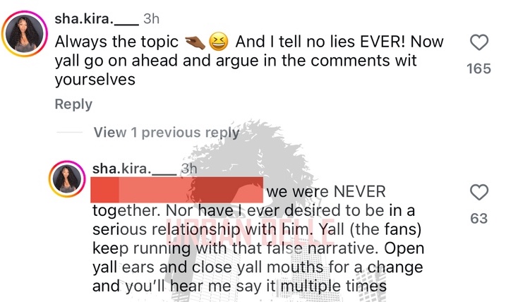 She wrote, “We were NEVER together. Nor have I ever desired to be in a serious relationship with him. Y’all (the fans) keep running with that false narrative. Open y’all ears and close y’all mouths for a change, and you’ll hear me say it multiple times.”
